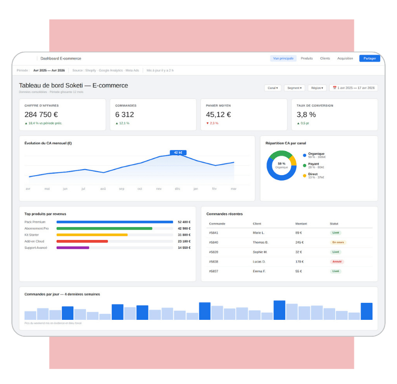 Nous mettons en place un dashboard Looker Studio personnalisé pour suivre vos ventes, votre trafic et vos campagnes, accompagné d’un reporting mensuel. Vous comprenez rapidement ce qui fonctionne et quelles actions prioriser pour améliorer vos performances.